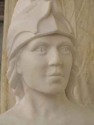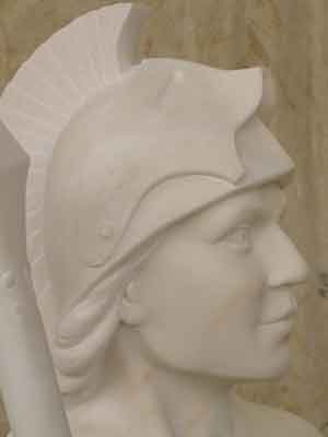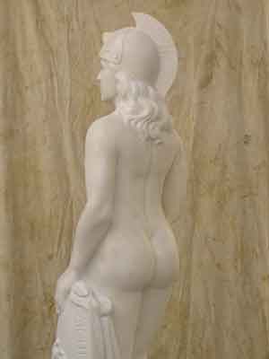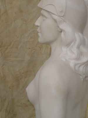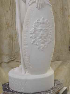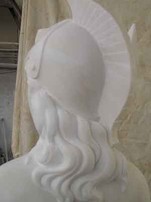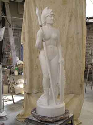 Eind 2003 kreeg ik van een echtpaar de opdracht een marmeren beeld van een naakte godin (Minerva) te kappen voor een grafmonument op het kerkhof te Laken. Samen met mijn collega Jean-Marie Baup heb ik dit beeld eerst op ware grootte geboetseerd in klei (1,85 meter). Het boetseren in klei laat toe rustig te zoeken naar de goede houding van het lichaam, de gewenste uitdrukking op het gezicht, de vorm van het schild, enz. Pas als het beeld helemaal voldeed aan de gestelde eisen, hebben we het afgegoten in gips om een hanteerbaar model te hebben. Daarna hebben we het met het systeem van de driepuntspasser uit de steen gekapt. Deze steen was een uitstekende blok roze marmer (rosé d’aurore) die perfect geschikt was om deze schitterende godin vorm te geven.